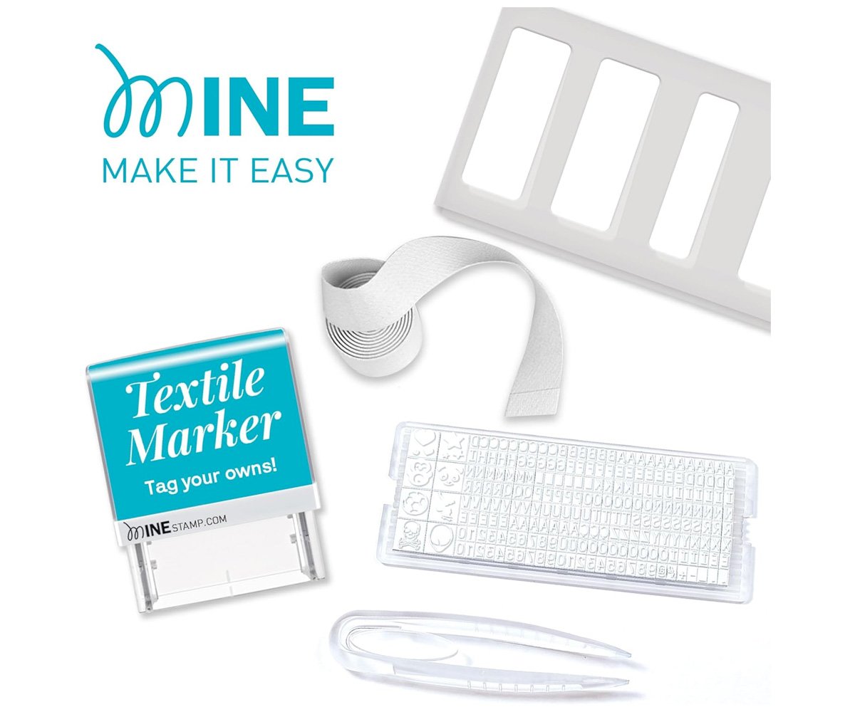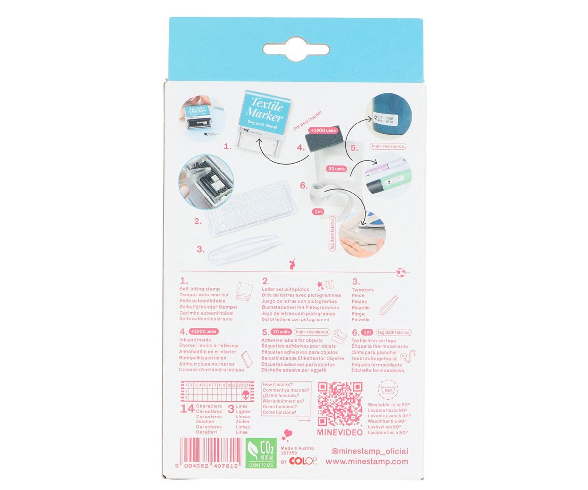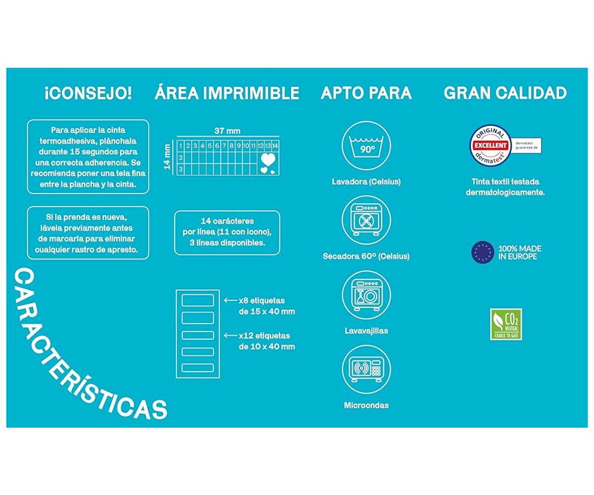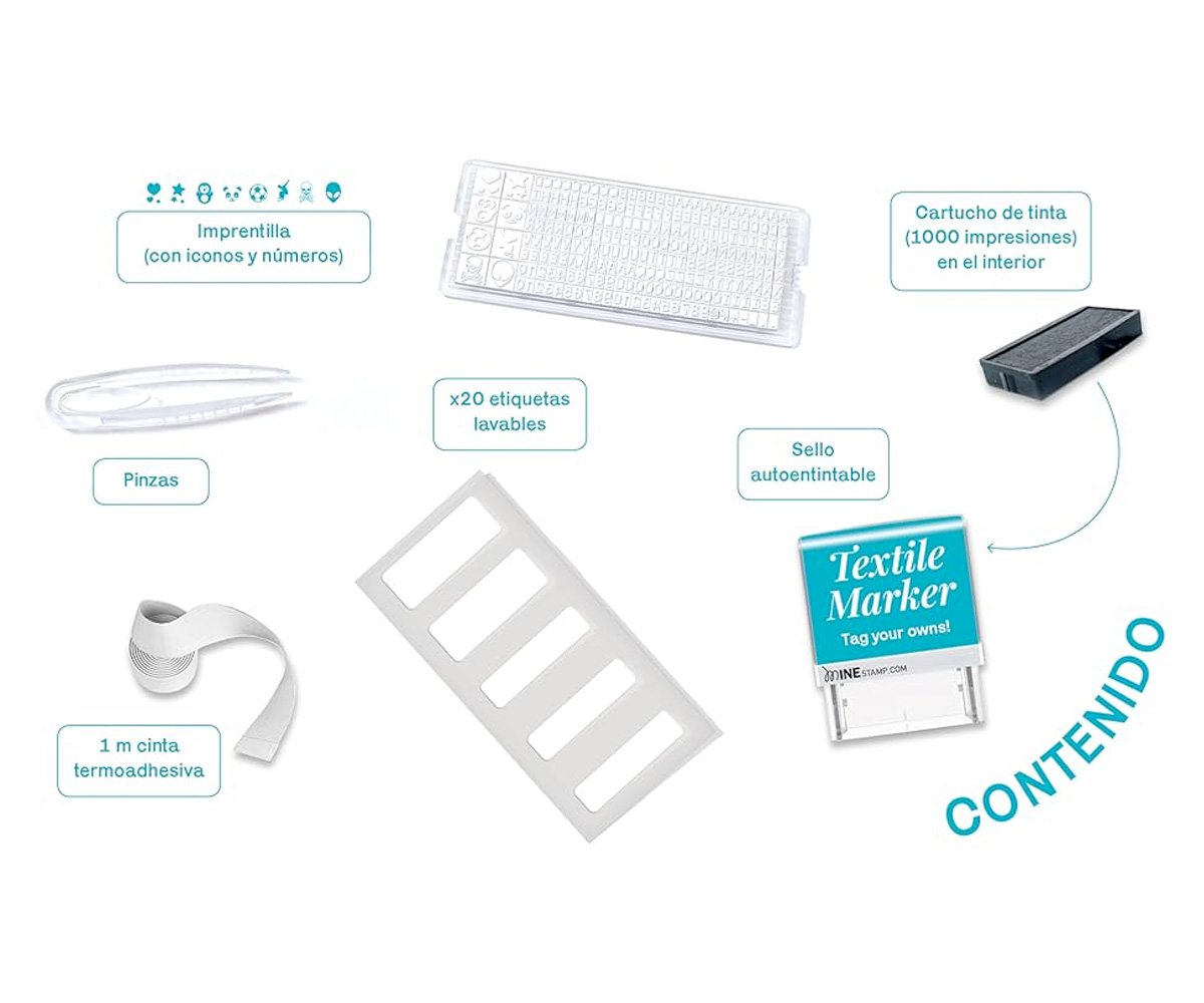 - Incluye: 1 sello autoentintable, 1 cartucho de tinta, 1 impresión con 256 caracteres (letras, números y signos de puntuación), 1 pinza para colocar fácilmente los caracteres, 20 etiquetas lavables, 1 metro cinta termoadhesiva